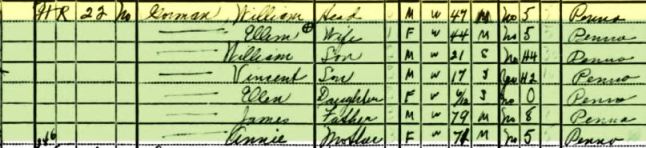 Purple marker on the map at the left shows 235 Mount Road in Aston, PA. The house address "235" was squeezed in above a box to the left of the "R" similar to the "246" below. The homes in this section were mill homes for the Parkmount Mill on the Chester Creek. Ellen provided the info to the census worker and it seems she shaved a year off of her age.![]() Aunt Nell (Ellen) was married to William Gorman who was a plush mill foreman making $3400 per year. Son William was a shear operator making $1070 per year. William rented the home for $22 per month. I wonder if both wage earners chipped in for the rent. William's father (James) and mother (Annie) are still living with their son and daughter-in-law. New daughter Ellen was recently born 6 months ago. |
