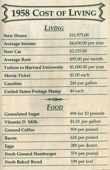 2020 prices and the multiple of 1958 prices $270,000 is 23 times the 1958 price $70,000 is 15 times the 1958 price $37,851 is 15 times the 1958 price $1,255 is 13 times the 1958 price (2 BR) $46,340 is 46 times the 1958 price (plus room/board/fees) $9.11 is 9 times the 1958 price $2.18 is 9 times the 1958 price 55 cents is 14 times the 1958 price $4.84 is 5 times the 1958 price $3.41 is 3 times the 1958 price $13.00 is 14 times the 1958 price $5.47 is 9 times the 1958 price (sliced) $1.64 is 6 times the 1958 price $4.46 is 8 times the 1958 price $2.55 is 13 times the 1958 price (sliced) |
