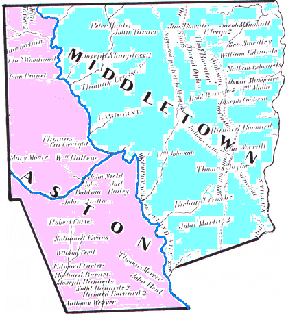 Townships. The West Branch of Chester Creek flows through Aston into Chester Creek. Many textile, lumber, and grist mills were built on these creeks. At the confluence of the West Branch of Chester Creek and Chester Creek in Aston pause your cursor there to see what that area is called. For a zoom view of that area click your mouse there. These two towns are where our branch of the Yarnall family tree lived for the generations of Eber, William, Grant, and Thomas after the Edgmont years. |