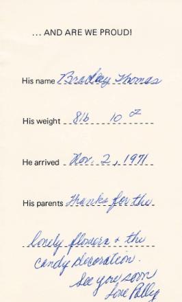 ![]() The front of Brad's birth announcement. Bradley is a name his parents, Polly and Tom, liked. |