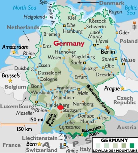 Our ancestors lived near the Neckar River (not shown on this map). It joins the Rhine River near Mannheim.![]() |