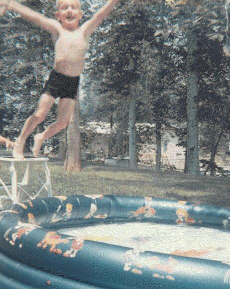 Polly has her hand close to Steve (look at his right foot) for his demo of a high dive into 3 inches of water.