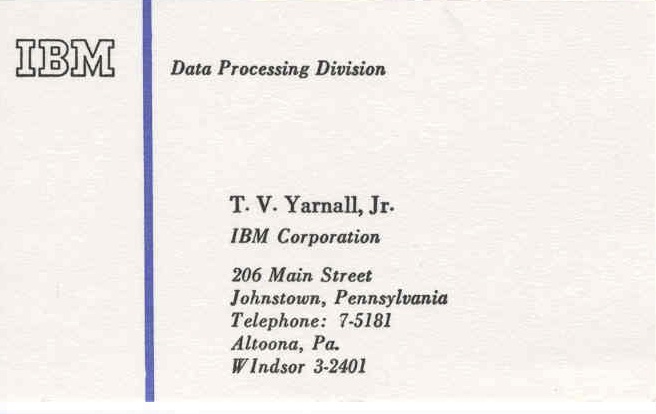 Still involved in sales, but in a new industry and at first in a support role as a systems analyst. My manager was not located in Pittsburgh. He was in Johnstown. We had an office there. The territory was even smaller - primarily 2 counties in western Pennsylvania. After almost a year I was assigned to be the sales rep. My best sale was to the Altoona Bank and Trust Company. I also had a significant sale to the Pennsylvania Railroad in Altoona. The IBM office in Virginia was looking for sales reps with success with banks and a friend from my training class suggested that I be considered. I got the chance to get out of poor old Altoona, Pennsylvania. |