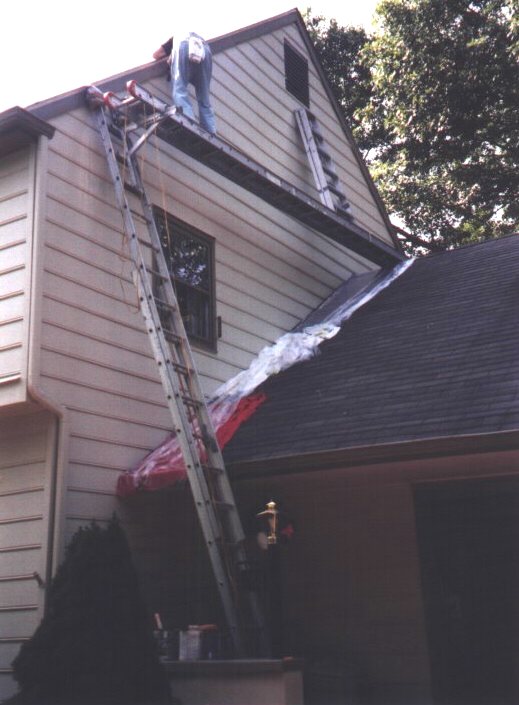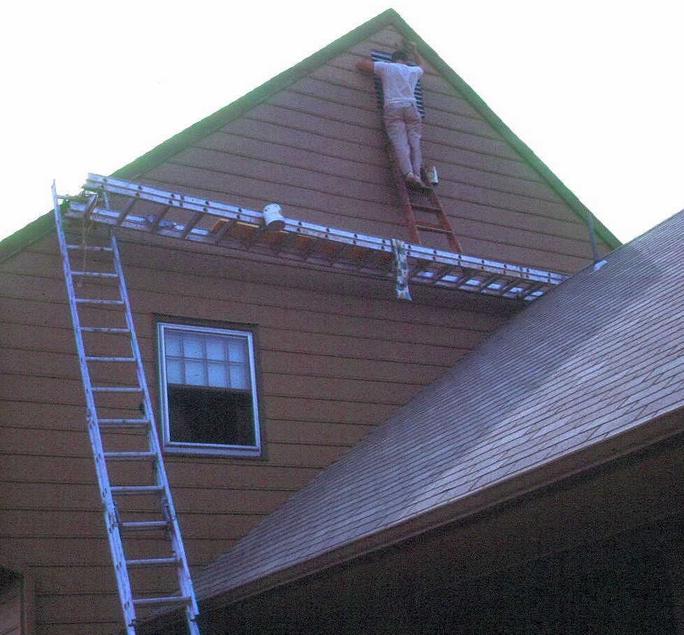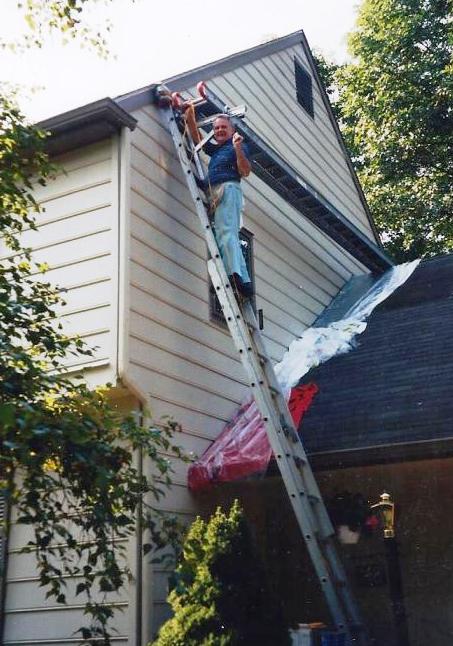 | He had to climb up onto the scaffold from the ladder. | One of about six times Tom painted their house between 1969 and 2012. Over the garage was the most difficult area to paint. |
