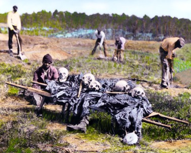 volleys were causing in the continuous waves of courageous Union soldiers. Shocked by the acres of dead and wounded covering the ground in front of the Rebel earthworks all along the line, Confederate Gen. Evander Law said, "I saw the carnage in front of Marye's hill at Fredericksburg and on the 'old railroad cut' which Jackson's men held at the Second Manassas; but nothing to exceed this. It was not war; it was murder." It was over in half an hour. The stunned attackers recoiled and sought the protective cover of their trenches, having left 7,000 of their comrades lying in the fields. The 30,000 Confederates involved in the attack suffered only 1,500 casualties. My great grandfather, William H. Yarnall, arrived at Cold Harbor as a member of the 2nd Pennsylvania Heavy Artillery on June 5th - two days after the slaughter. He was assigned to recovering the dead and wounded on June 7th. This probably is what prompted him to shoot himself in the hand to get relieved of duty. It was an extremely hot day and the assignment was brutal. The left margin of his discharge document has notations about a self-inflicted wound. On the right is a picture taken on that battlefield after the end of the Civil War. Incredibly, Grant ordered another attack. The soldiers all along the line refused to obey. Defiant Capt. T.E. Barker said, "I would not take my regiment in another such charge if Jesus Christ himself ordered it!" |