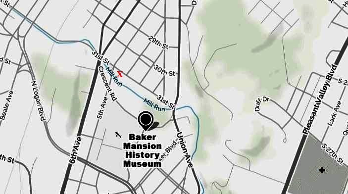| Heart marks 313 31st Street. | Tiny red X is where our house was with Mill Run Creek along our back yard. |
