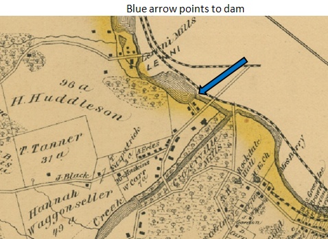 The above map does not have New Road in it. The four buildings for the mill homes are shown. Below is a picture of one of the mill homes from across the creek and looking over the dam.