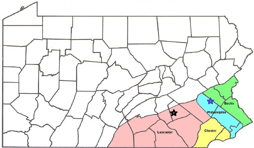 Below are four early counties of Pennsylvania colored in their original configurations. The area of each county was subdivided as their population increased. Bucks had two subdivisions. Philadelphia had two. Chester had one. Lancaster had seven.