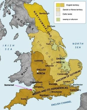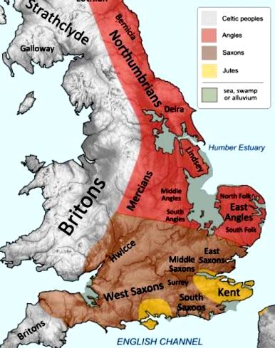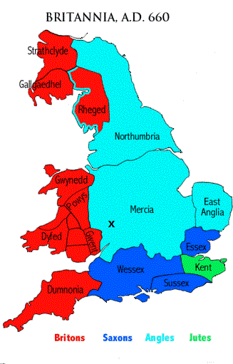 In 628 the Saxons lost their dominance of Mercia. It is clear from the subsequent history of the area that Penda (an Angle) defeated the Saxons. The above map shows that the Mercia Kingdom replaced the Hwicce Kingdom. Both were Anglo-Saxon kingdoms at one time. Next came the Vikings who were comprised of people from Denmark and Scandinavia. The above map shows territories after the Danish (aka Norse) invasion. Notice that Mercia is split into Danish and English sections by the 10th century. The references to Danish, Norse, and Vikings were synonyms.