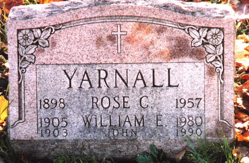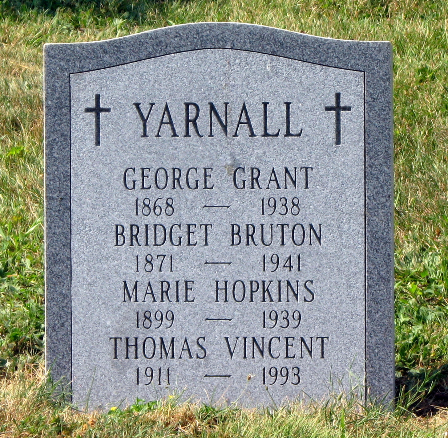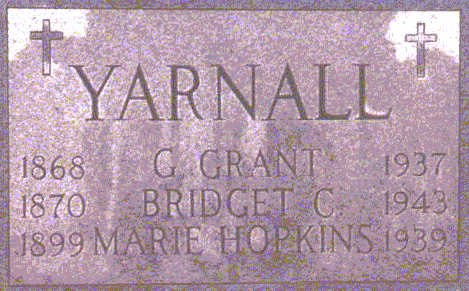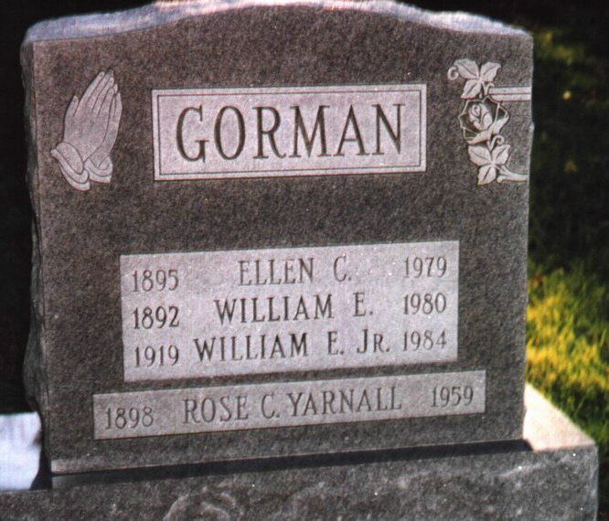 children was Ellen C (Aunt Nell). She married William E Gorman. Their names are on their gravestone along with the name of their oldest son (William Jr) and my Aunt Rose. You can see there is a difference in the dates of death for Rose on the two stones. Aunt Rose took great care of me in my pre-school years. I lost touch after I moved to Springfield in 1943. She did not have a car and neither did my mother and dad. I was in the Army in Germany when she died. The dates of death for Grant and Bridget's eight children (in date of birth order) were as follows: