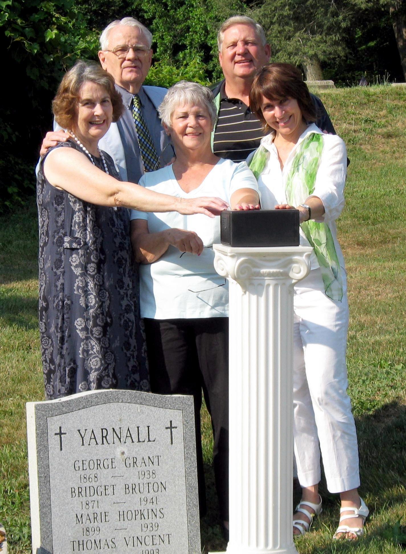 1871. Sarah Marie Yarnall Hopkins (Grant and Bridget's daughter) was one of my aunts on the Yarnall side. It must have been a sad day for my grandmother when one of her children preceded her in death. I assume the Hopkins family was nice enough to have the stone include her parents' names when it was placed on the grave. Probably the gravestone was placed sometime after my grandmother died. In 2008 we replaced it with a new gravestone with my father's name and dates and we corrected the three errors. His cremains were buried on June 27, 2008. A picture of the new stone is on the right. A picture of those at the ceremony is below. Left to right - Polly (my wife), me, Sue (my sister), Bill (my brother), and Louise (our daughter).