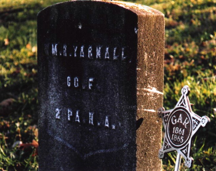 kind of gravestone. It was well worn in 2002 so I had to rub chalk on the letters to make them clear enough to be seen in the picture that I took. It says: W. H. Yarnall CO F (that means Company F) 2 PA H.A. (that means Second Pennsylvania Heavy Artillery). This gravestone is located about 20 feet to the right of the steps that go up the hill of the old original cemetery, about 20 feet from the stone wall behind the St Francis Church. |