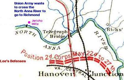 red lines for the Confederates. Grant's plan called for the path of the battle to follow the railroad lines because it would be easier to move the heavy artillery of cannons and mortars. The Union Army temporarily advanced across the river on both sides of a shallow point in the river called Ox Ford but could not go farther. About two miles west of Ox Ford was Jericho Mills (look at the map on the far right). Grant had to withdraw. Now his challenge was to try to cross at another point on this river or another river to get to Richmond.