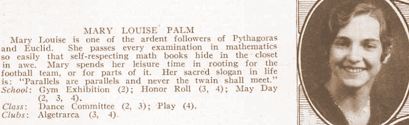 | Birth date and birthplace She was born May 12, 1914 in Harrisburg, PA. One of four She was the youngest in the family of Samuel Moyer Palm and Florence Isabel Rohrbach Palm. Her siblings were William Henry (b:1903), Sarah Isabel (b:1905), and Samuel M Jr.(b:1909). Early records The earliest census record of her is at age 5 in the 1920 census for Swatara Township, Paxtang Borough, Dauphin County, PA. We have a picture of her with her two cousins - sons of her mother's sister. She looks to be about 7 to 9. Her family may have lived in Philadelphia briefly because her personal history record from Upper Darby High School indicates she attended two elementary schools in Philadelphia and one in Yeadon. Her 1930 home was in Yeadon Boro, Delaware County, PA. They might have moved to Yeadon before she was in the sixth grade in 1926. I wish she had told me about those days. Very promising scholar I obtained her school records in 2003. She never told me how well she did in school. She skipped the 7th grade and was valedictorian of her 8th grade class at the Sheffield School in Yeadon, PA. She was an outstanding student in high school. She attended Upper Darby High School for her 9th through 12th grades. She took the Academic curriculum because she planned to continue her education after high school. If she enrolled in the Philadelphia School of Design, she was planning on becoming a dress designer. If she was accepted at Temple University or the University of Pennsylvania, she was planning on being an algebra teacher. She ranked 39th in her graduating class of 314 students at Upper Darby High School. She had all A and B grades in her senior year - the year after her Mother died. She was the homemaker for her Father yet only missed 8 days of school and performed the part of a wedding guest in her senior class play while getting outstanding grades. She was in the mathematics club, a dance group, and active in the Campfire Girls organization. She graduated June 11, 1931 at the age of 17. Her school records indicated she was tardy only twice in four years. Her favorite classes were Algebra, Art, Geometry, and Trigonometry. She was on the honor roll in Oct-Nov 1929 and in her Junior and Senior years.