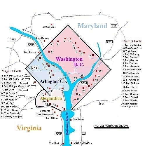 | On May 16, 1864, Colonel Gibson received word to be ready to move the Second Pennsylvania Heavy Artillery regiment from Fort Ethan Allen (#1 below) on short notice. On May 25, at 5:00 A. M. Orders received - cook five days' extra rations, and be prepared to go at 12 noon. (see initial cause of delay at right) On May 27 at 4:00 P. M. Batteries (aka Companies) A, G, H and I "fell in" and marched to Fort Whipple (#4 below), about five miles farther down the Potomac River. The command was split up and groups stayed at Forts Smith (#2), Corcoran, Bennett, Strong (#3), Morton, Cass (#5), Scott (#7), Albany, Jackson, McPherson, and one or two others. Ft Whipple Now On May 28 at 7:00 A. M. the regiment marched from Fort Whipple to Washington by way of the Aqueduct bridge to be reviewed by President Lincoln. (additional delay) ![]() |