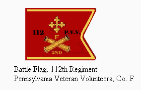 unit that engaged the Confederates. I was in the signal and finance corps of the Army for two years but I was not near any battles like he was. He was assigned to the battle that General Grant said in his memoirs he wished he had never ordered - Cold Harbor. The flag (colors) for Company F that went into battle with them is shown on the right. |