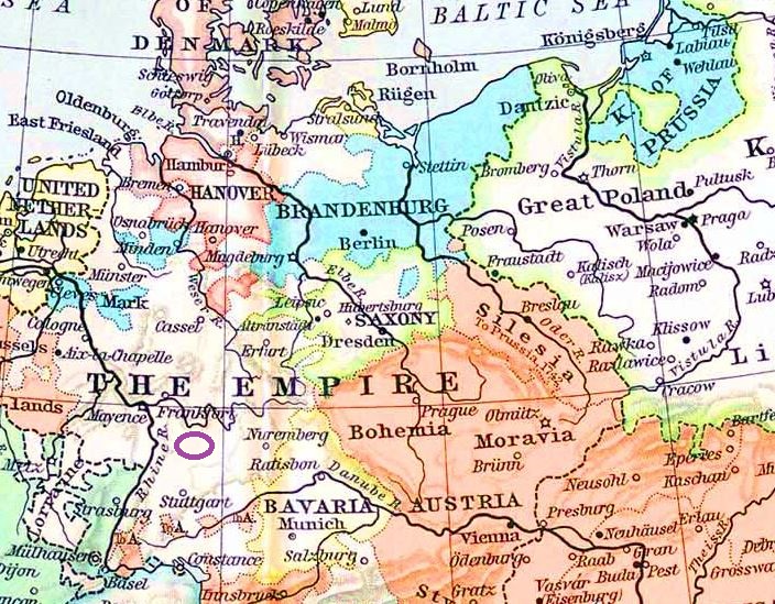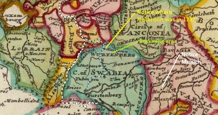 Below is a 1732 map. You can see that "Baden", "Haibron", and "Wurtenberg" were part of area named Swabia between Alsace and Bavaria. You can see the Rhine River (white) and Neckar River (light blue). Johannes and his first wife (Christiana