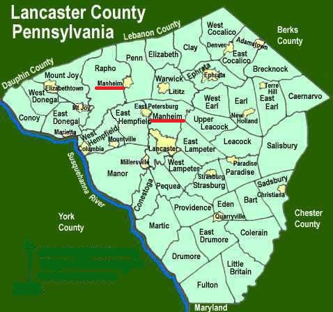 page near the end of the list of passengers. John's name is not on the list. Johannes and John left Germany during the time many protestants were fleeing in vain from one principality to another, to avoid persecution. Many sought asylum in the new land, often settling in the upper part of New Jersey, in the vicinity of Elizabeth and Springfield. This is where Dr. John Palm first settled. His name is registered in the baptismal records of St. John's church in Elizabeth Town, New Jersey on November 9, 1751 (John Pallam, a German). There were difficulties in obtaining titles to lands and most of these immigrants decided to relocate by going overland to the Susquenhanna River, then embarking on rafts to what is now Middletown, a few miles below Harrisburg, Pennsylvania. Here they turned their rafts up the Swatara River, landing about 2 miles north of Palmyra, Pennsylvania in 1723. Johannes and son John did this around 1760. John founded the town of Palmyra, PA (see red area in map on left). On a 100 acre farm he reigned as 'Lord of the Manor', dispensing health and comfort to the people of the still sparsely settled community for a period of over 30 years. He had an extensive practice, and owing to the country being thinly settled, it was very laborious. Patients frequently came from long distances to consult with him. The medicines he used were mostly of vegetable extraction. Having an extensive laboratory, he prepared most of his own medicines. He distilled his own essential oils, waters, etc. from herbs and flowers. He was confirmed into the Lutheran Church. Within a few years quite a settlement sprung, and gradually a village received the name of Palmstown or Palmsettle (named after Dr. Palm). The name of the settlement has since been changed to Palmyra (1810). Palmyra was named after one of the ancient cities built by King Solomon of the bible history. The name implies "the City of Palms". When his material fortunes increased he was able to add the Coffeetown tract (about a mile northeast of his Palmyra tract) to his possessions in 1777. The facts are recited to show how the energy and thrift, not alone of the physician, but also of the farmer and trader, were rewarded in those days in the new land of opportunity. Johannes (John) and his second wife (Catharine Salome Fenger - b:1730 m:1752 d:1784) had their seventh child who was named Michael Palm (b:5/5/1770 - d:7/31/1836). He had a third wife named Elizabeth Klein Smiley or Williams who had been captured by the Indians from 1757 until 1762. They married in the late 1780s. John died 4/25/1799 in Palmyra at age 85. His gravesite is in the Bindnagle Cemetery.Michael and his second wife (Barbara Synder) had a son, George Palm, who was born August 31, 1790. George and his wife Elizabeth had a son, David Palm, in 1821 who became a farmer in Mill Creek, PA in Lebanon County. David married Elizabette Mutschell 10/22/1853 and their first child, William Palm, was born in 1854 or 1855. I have not been able to find out the month and day. William married Lydia Moyer and had a son, Samuel Moyer Palm, in 1882 on July 12th in Manheim, Lancaster County, PA. He was my mother's dad. Can you find Manheim in the map at the left? Pause your cursor on each. One is a township and one is the town (light yellow). I am not sure which was their address. |
