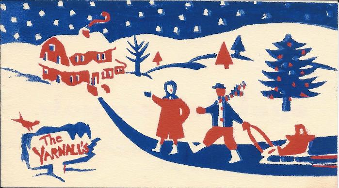 Polly drew our house perfectly and included our big beautiful blue spruce tree. Louise is on the sled.