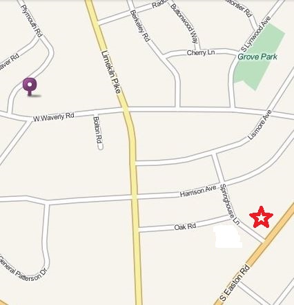 Polly lived where the purple marker is. The red star shows where the Glenside Elementary School was. |