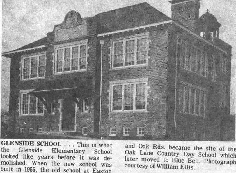 slightly over an acre, was located on Easton Road just north of Springhouse Lane and cost $4,000. Anticipating the opening of the new Glenside School in September 1908, the Audenried School was closed in June. Unfortunately construction problems developed necessitating the children to attend classes in the Glenside Baptist Church at Easton Road and Wesley Avenue until the Glenside Elementary School was ready for classes in September 1909. The school served the community for 46 school years (09-10 through 55-56) before it closed its doors in June 1956. |