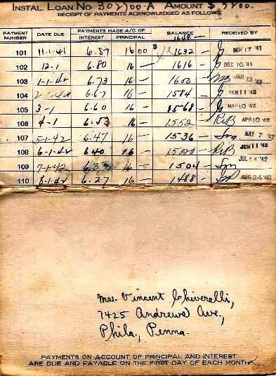 | A receipt book of 9 pages was in the keepsakes of Vincent and Ruth Cheverelli. It was the installment loan record for their mortgage on the house they purchased on Andrews Avenue in 1933. The loan was for $3,200 (see top of page on right). The principal payment was $16.00 each month. The interest payment each month started at $15.92 for the November 1933 payment and decreased each month. You can see on the page on the right that the interest was only $6.27 for the August 1942 payment. The mortgage was held by the Prudential Insurance Company. The due dates for the payments seem to be the first of the month, yet the payments were recorded as being made on dates later than that. They had reduced the balance of the loan to $1,488 by the time they moved from 7425 Andrews Avenue in Philadelphia, PA to 519 Plymouth Road in Glenside, PA. |