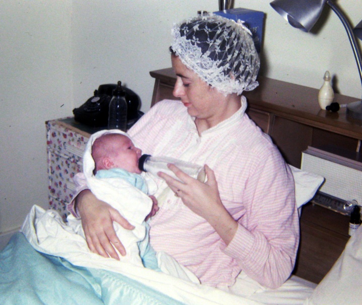 Notice the nasal cleaning items on the headboard of the bed behind his mother.