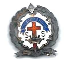 Below is the pin for perfect attendance at Sunday School. The white part is for one year. The wreath is for two years. Hanging from the wreath were bars for years three through five.