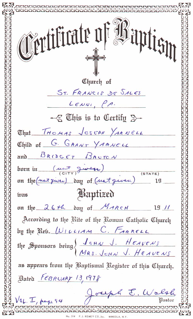 name of Joseph (rather than Vincent) shown on the document is the name of a saint