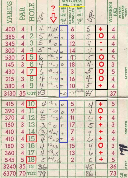 and I had a 16 that day so he had to give me a stroke on five holes (5, 7, 10, 15, and 18). Those holes are marked with red outlines on the scorecard. It is not clear to me what the blue outlined marks on the scorecard represent. The black outlined marks are the correct score. The marks in red show 9 holes won, 7 halved, and 2 lost. I do not know what the column with the question mark represents. I think my brother was marking the scorecard.