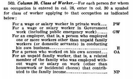 On page 67 of the 88 page booklet of instructions for the census enumerator they are given a list of codes.