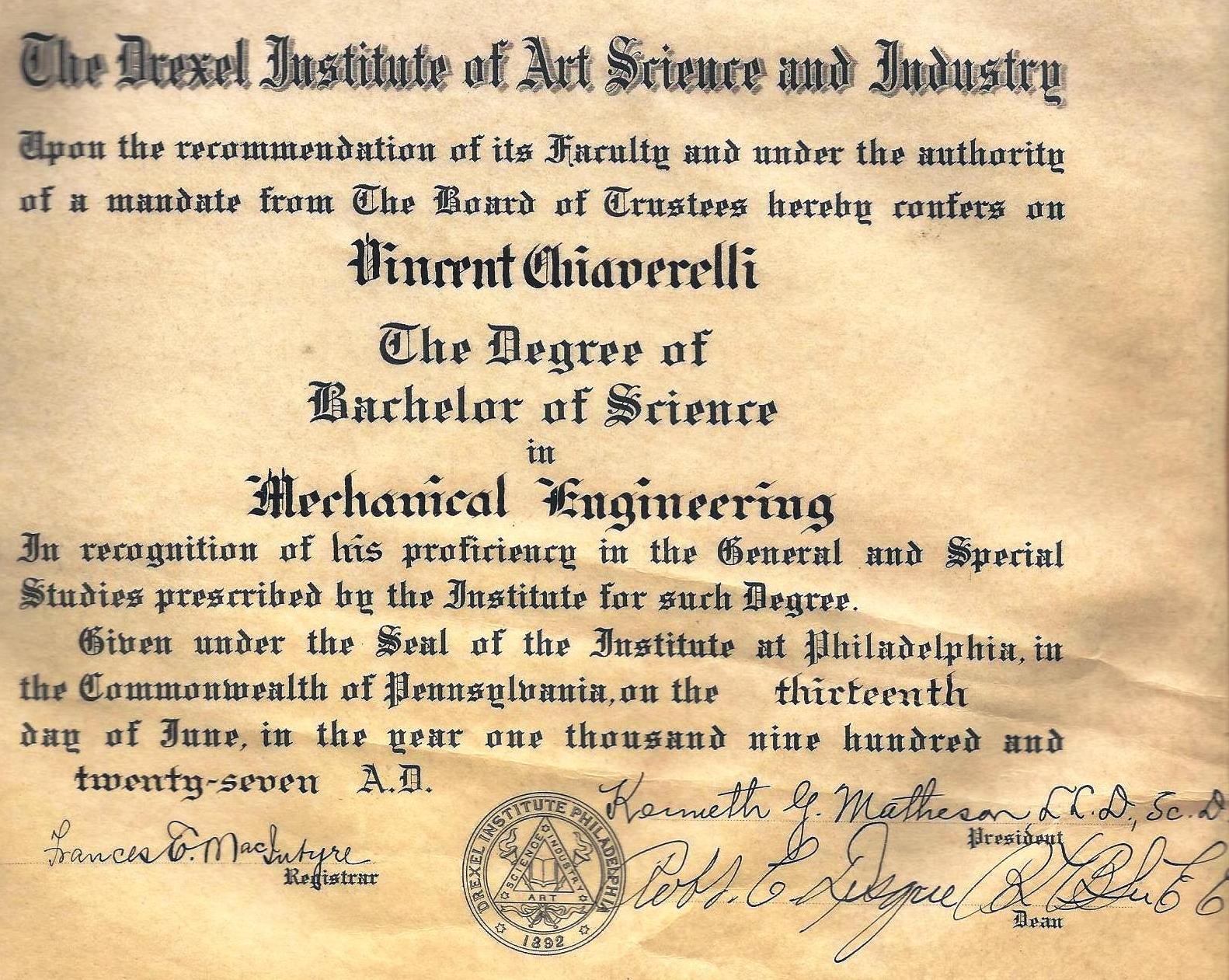 Copy of his degree from Drexel.