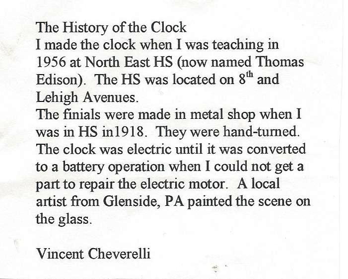 His first mantel clock (shown on the right) was for his home. He typed a note about it. This clock was given to his grandson, Brad.