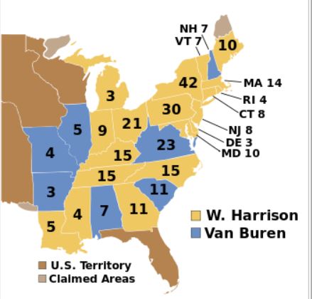 A Whig (Harrison) defeated a Democrat (Van Buren). An electoral votes map is on the right.