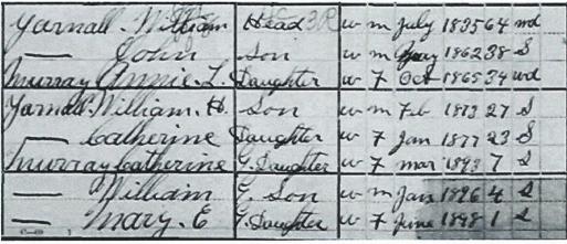 Catherine (age 23), born January 1877, single, a bobbin winder plus Annie's three children (2 girls - Catherine age 7 and Mary age 1 and a boy - William age 4). |