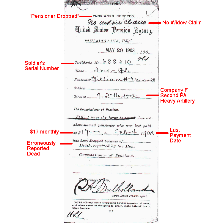 In 1903, William H Yarnall received this notice terminating his pension and seriously reducing his income.